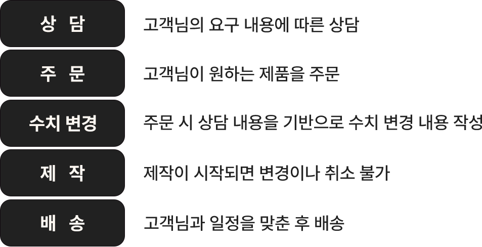 상담 ➝ 주문 ➝ 상담을 통한 수치 변경 (필요 시) ➝ 제작 ➝ 배송